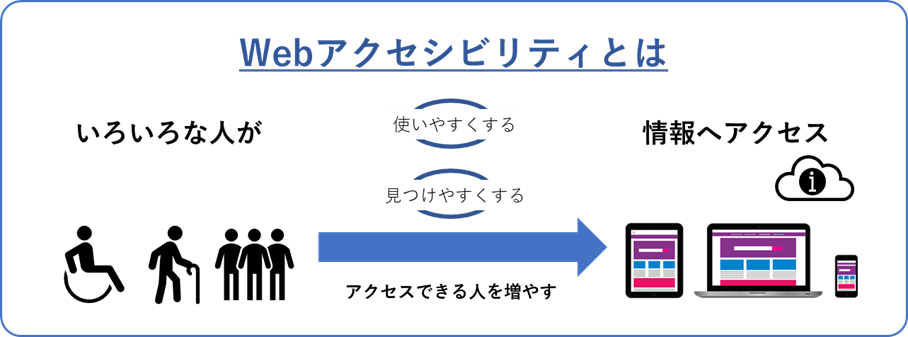 アクセシビリティ(accessibility)とは、直訳すると「利用しやすさ」「アクセスしやすさ」です。「ウェブ(Web)アクセシビリティ」とは、こういった配慮をウェブサイトに対しても行うことです。