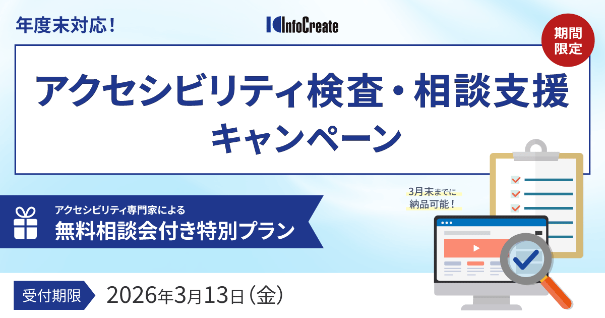 インフォ・クリエイツでは、Webアクセシビリティに関する2026年3月13日(金)受付分までの期間限定で、アクセシビリティ専門家による相談会が付いた特別キャンペーンを実施します。
