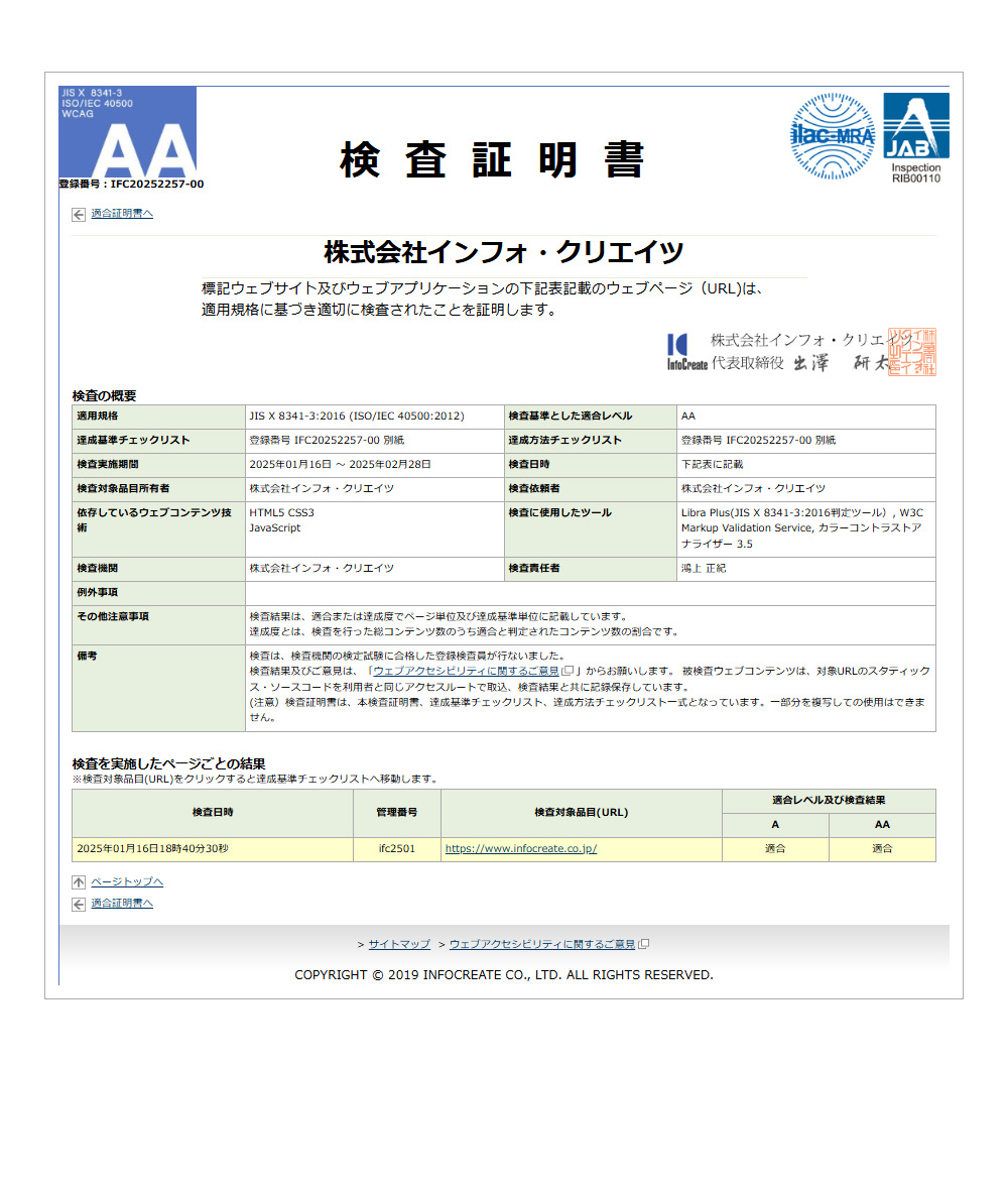 対象WebページがWebアクセシビリティの規格に適合しているかWebアクセシビリティ専門の検査員が検査を行うサービスです。適合ページには適合証明書を発行することができます。